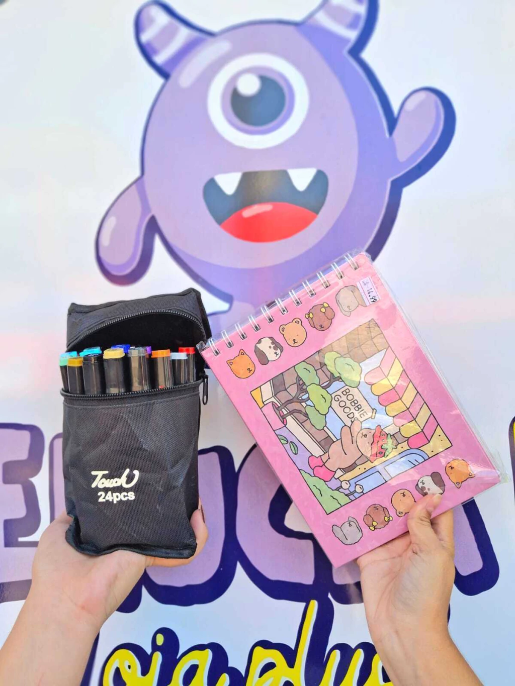 Caderno com várias folhas para colorir + estojo com canetinhas de 24und da marca Touch